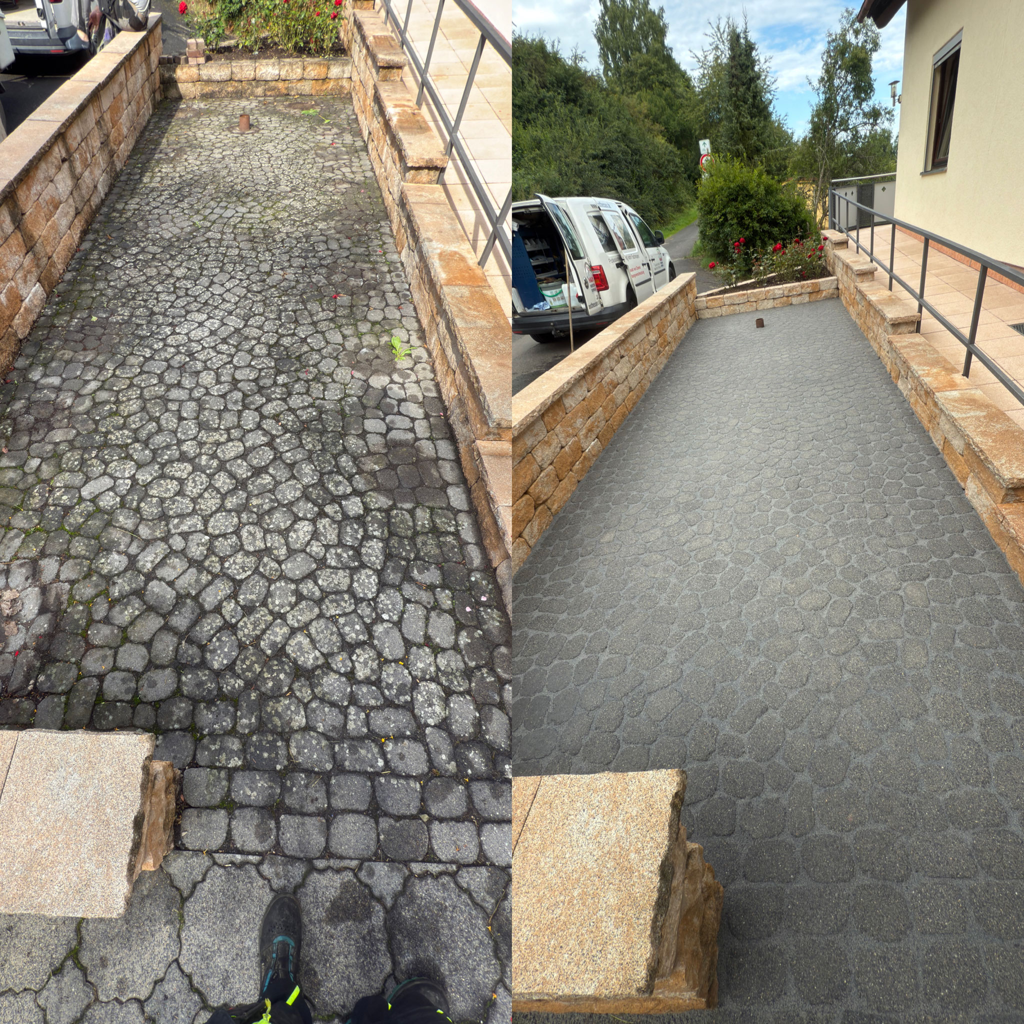 Reinigen von Außenflächen wie z. B. Terrassenreinigung oder Einfahrten, Parkplätze, Pflasterflächen, Gehwege, Parkanlagen oder Verkehrsflächen reinigen mit den professionellen Hochdruckreinigern oder Hochdruckstrahlanlagen.